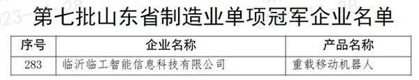 近日,山東省工業和信息化廳公布了第七批山東省制造業單項冠軍企業名單,臨沂臨工智能信息科技有限公司成功入選,此次單項冠軍企業入選,是對臨工智科在行業地位、品牌價值及企業綜合雄厚實力方面的充分肯定和高度認可。